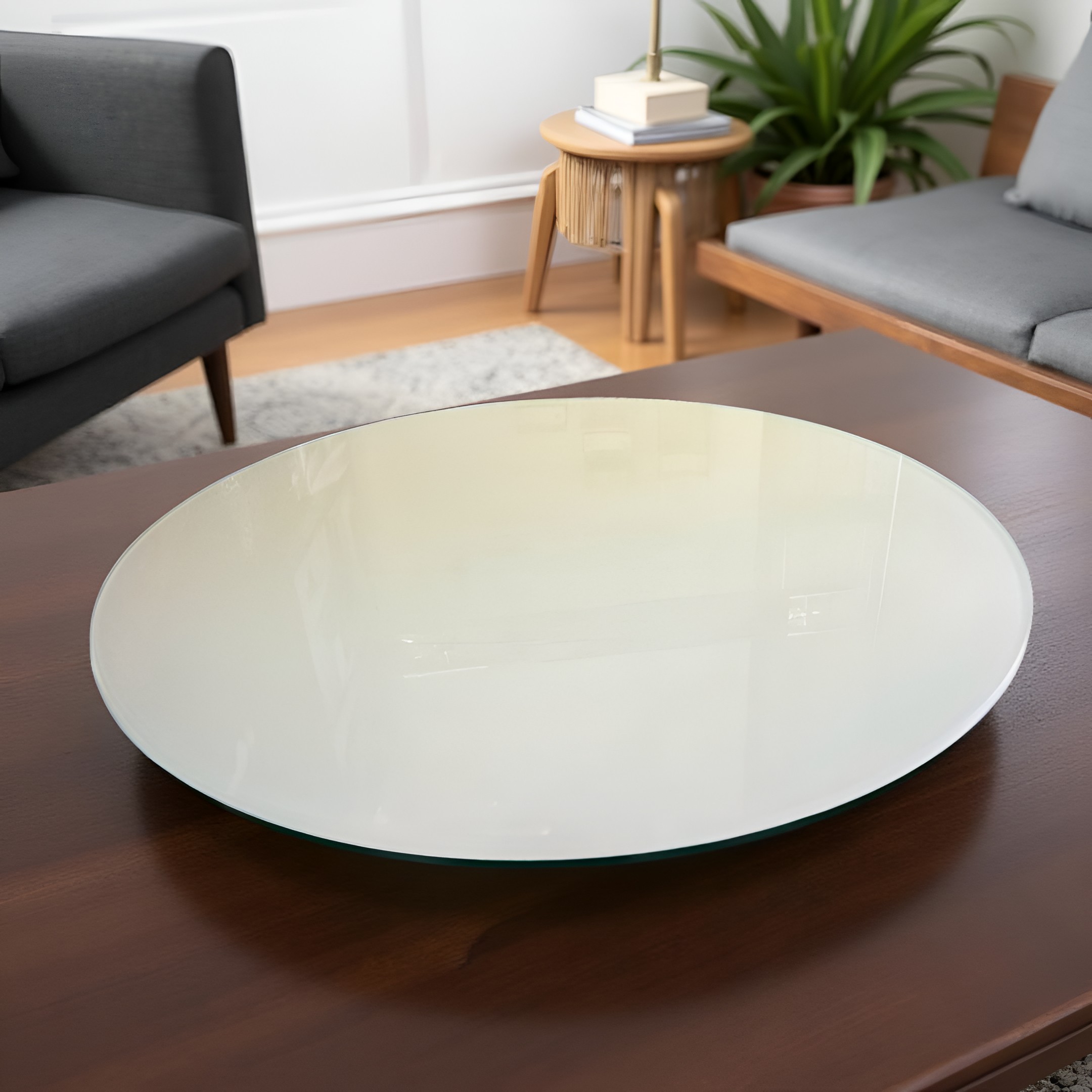 Fabricado em vidro temperado de 8mm, com base giratória em alumínio, este modelo redondo é perfeito para mesas de jantar, mesas grandes, áreas gourmet e ambientes corporativos.