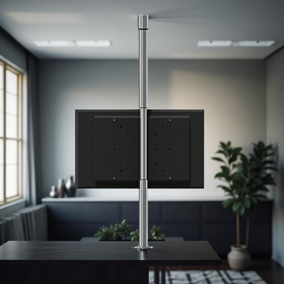 Projetado para integrar a TV ao mobiliário de forma elegante, este modelo permite a instalação do móvel ao teto ou de móvel para móvel, criando um visual limpo e sofisticado.
