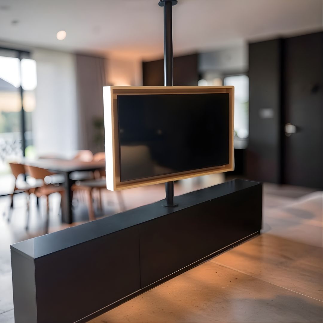 O Suporte Giratório para TV com tubo inteiriço sob medida é a solução ideal para projetos que utilizam caixa de madeira, painéis ou móveis planejados, garantindo um acabamento moderno, funcional e totalmente integrado ao ambiente.