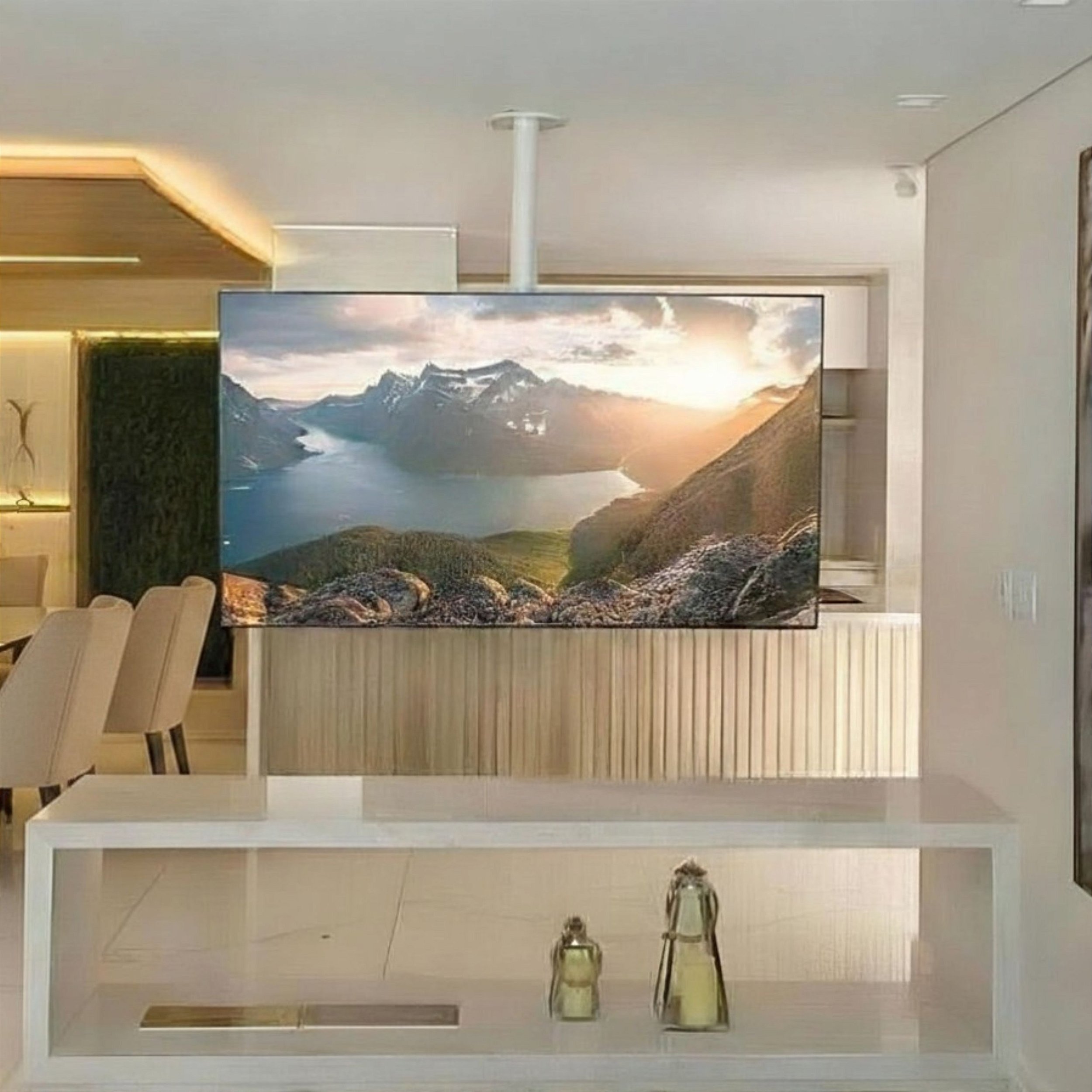 Perfeito para ambientes integrados, ele proporciona um visual limpo também na parte de trás da TV — algo essencial quando o aparelho fica visível em todos os ângulos.